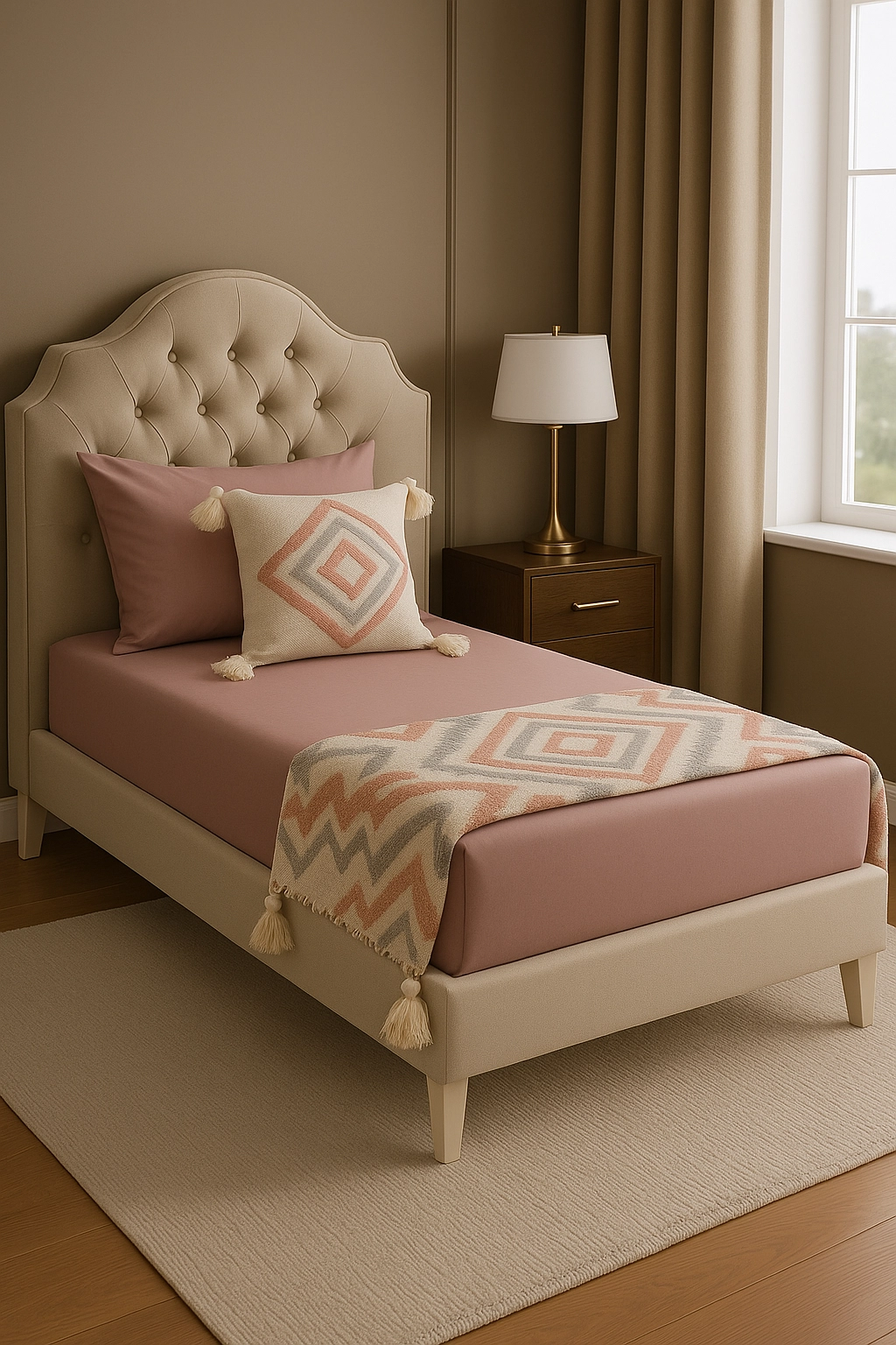 نیمست هتلی تکنفره ۱۲۰×۲۰۰ با ملحفه ۴ طرف کشدار و روبالشی نخپنبهای، لطیف و خنک است. مناسب تختهای کوچک و تشکهای با ارتفاع تا ۲۵ سانتیمتر و شستوشوی آسان با آب ملایم.